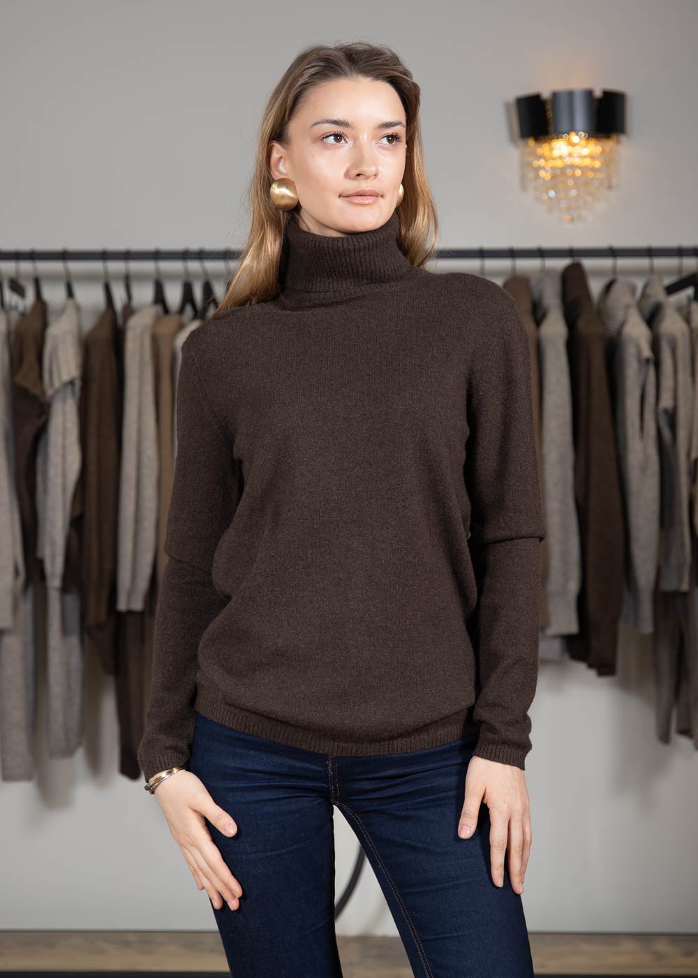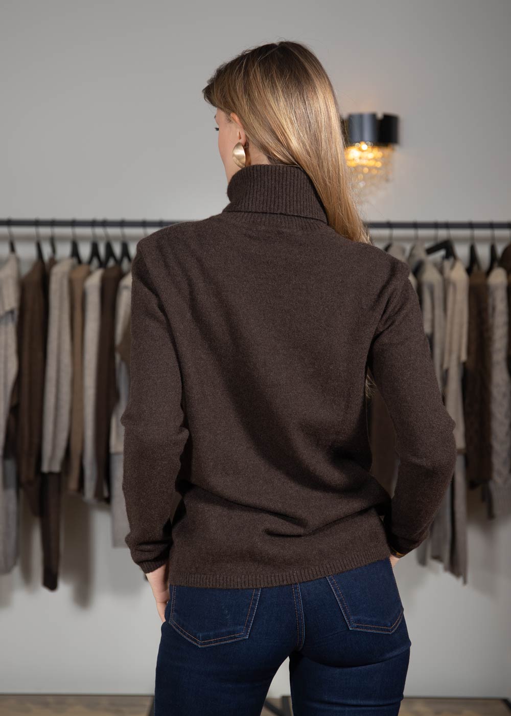Темно-коричневый свитер с высоким воротом и неширокой резинкой на рукавах и внизу станет для вас любимым элементом одежды прохладными осенними или весенними днями.
