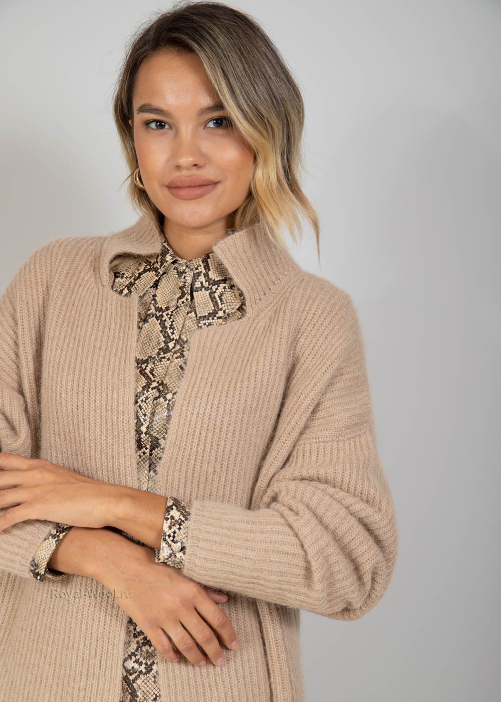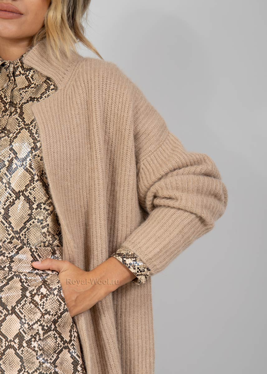Оригинальный покрой и благородный бежевый цвет этой модели кардигана из натуральной верблюжьей шерсти придется по вкусу каждой даме, ценящей удобство и элегантный внешний вид.